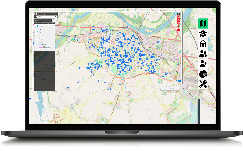 - Integrazione e automazione: Il sistema si collega alle banche dati del MIUR e a quelle del trasporto pubblico locale. Attraverso script Python, è in grado di elaborare e uniformare dati eterogenei provenienti da fonti diffuse. La ricerca degli indirizzi è supportata da OpenStreetMap, garantendo l’uso di dati open source e di beni comuni digitali.